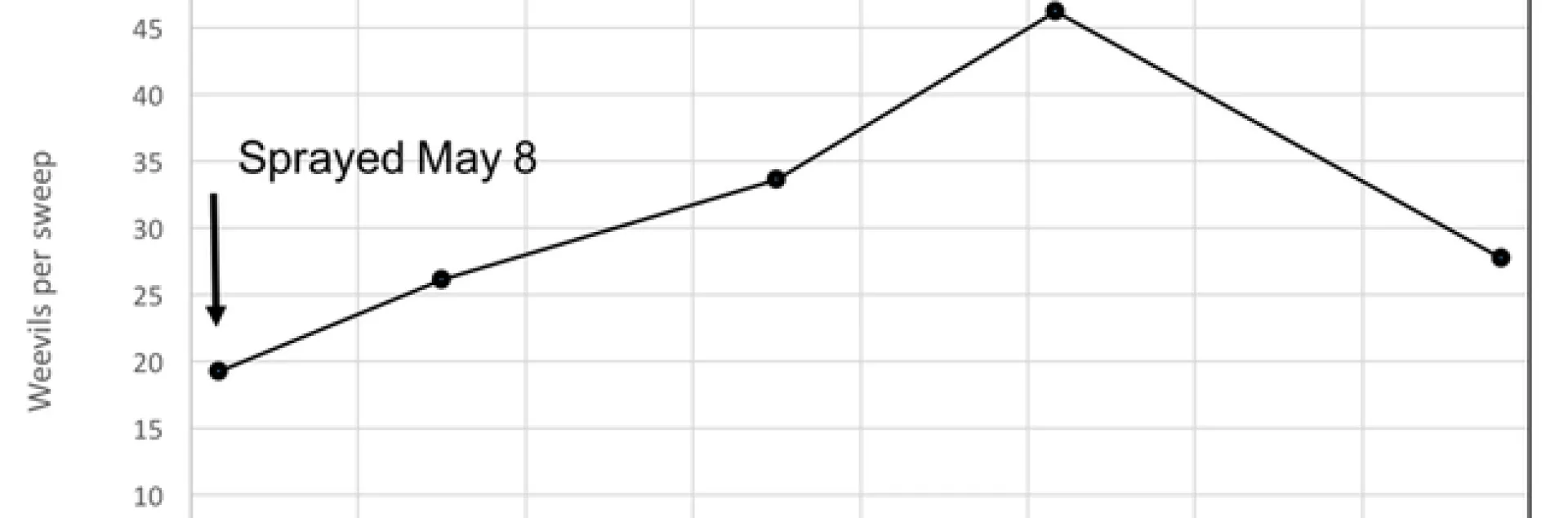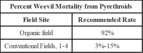 Table 1. Percent weevil mortality from pyrethroids (Baythroid and Warrior), indicating pyrethroid resistance in Intermountain alfalfa fields (Orloff et al. 2016).