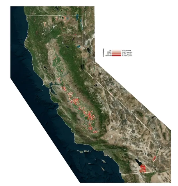 Figure 3. Map of Chlorpyrifos applications, CA, 2013-2017. Chlorpryifos has been used throughout the major alfalfa growing areas of California (Intermountain, Central Valley, and Desert) for many years, mostly for alfalfa weevil and aphid control - a practice which will wind down in 2020. Data: CA Pesticide Use Report.