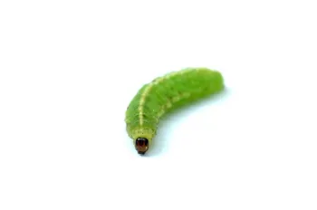 Figure 1. Alfalfa weevil larva, a key pest in California's alfalfa fields in the spring months (January-May), reducing yields and quality from feeding on the foliage. Chlorpyrifos has been widely used to control this pest, but in 2020, growers will need to look for alternatives. (Photo: Ian Grettenburger)