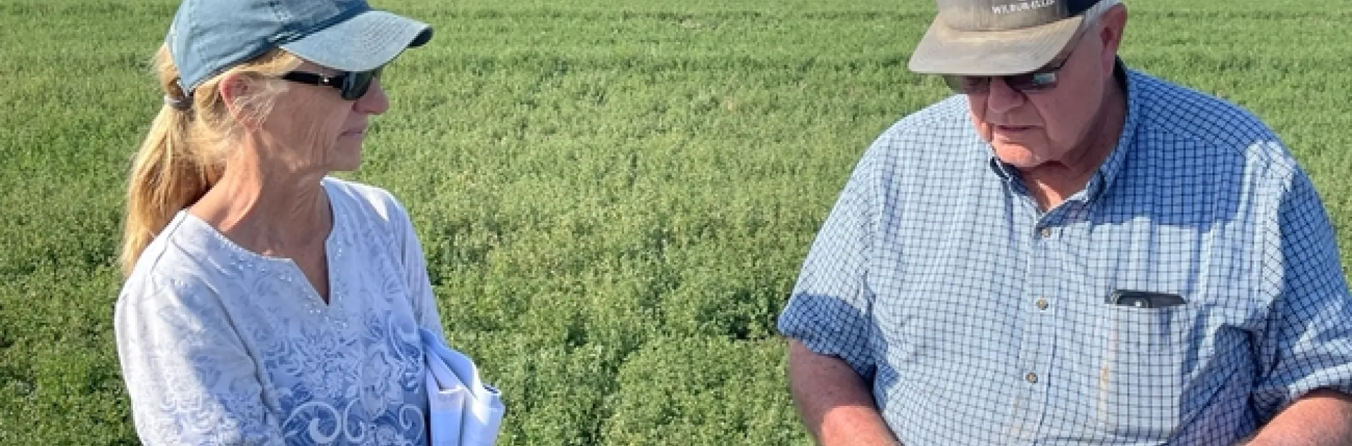 Figure 3. UCCE Advisor Rachael Long (left) and grower Ron Tadlock consult on one of his drought stressed fields in Yolo County, CA, April, 2022. The soil has become very dry. Since at least 3 weeks remain before the first harvest, he elected to water the field to provide water for the upcoming hot periods. It's important to 'fill the deep profile' for alfalfa on good soils to maximize early yields, and provide residual moisture for additional cuttings.