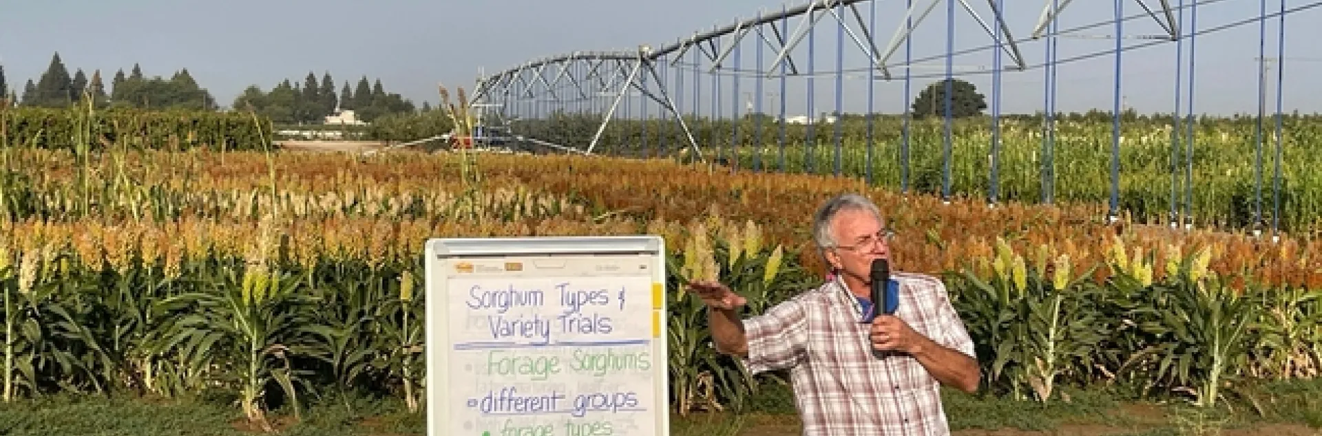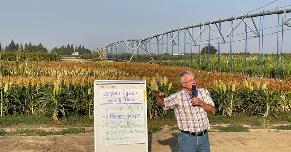 Dr. Bob Hutmacher shows data from sorghum field trials at the Kearney Field Day, 2021.