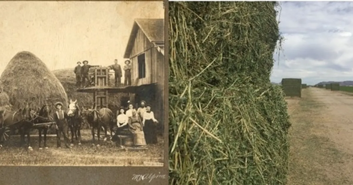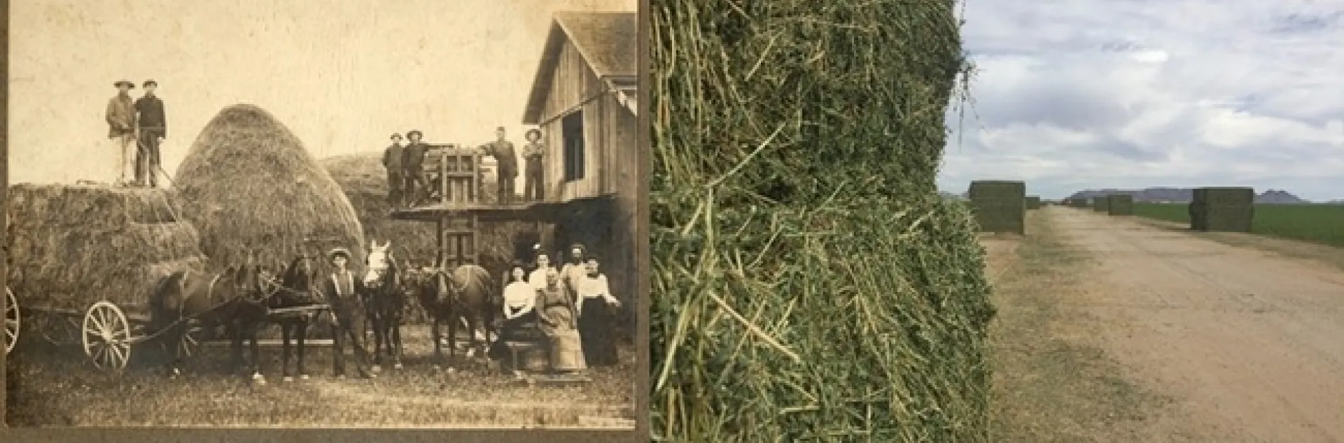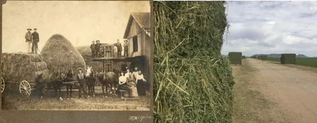 Figure 1. Historically, technology has limited the transport of hay products (left, circa 1890), while modern methods have improved the ability to ship bulky hay products long distances (right 700 kg. hay bales in Arizona awaiting export to the Middle East).