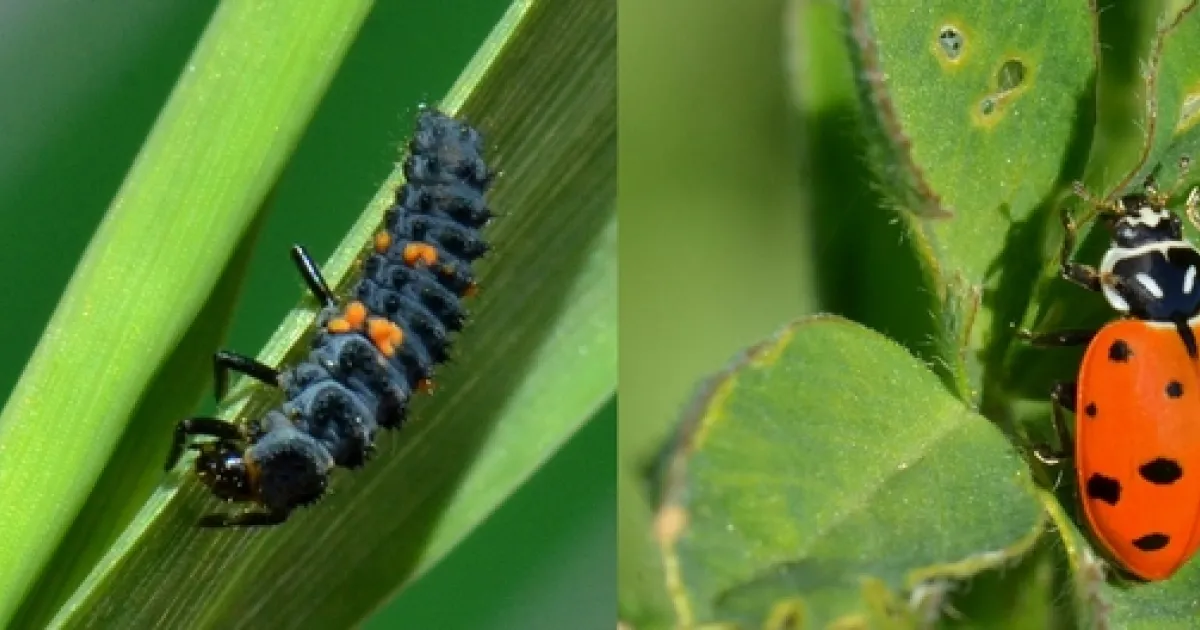 Figure 1. Larval (lef) and adult (right) convergent lady beetle (Hippodamia convergens). This species is an important aphid predator in alfalfa. (Photos: Ian Grettenberger, UC Davis)