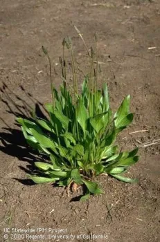 Butyrac 200 (2,4-DB) could be an option for control of either curly dock, or common plantain. According to the UC IPM herbicide sensitivity chart for alfalfa, Butyrac 200 is able to partially control established broadleaf plantain. Where the label indicates, applications to small curly dock plants less than 3-inches can also be expected to provide suppression. However, potential crop injury may also be a deterrent for use in established stands. Crop safety of alfalfa to Butyrac 200 is better for seedling alfalfa as compared to established plants, which are likely to display more leaf deformation and yellowing. If applications of Butyrac 200 are made, healthy, actively growing alfalfa will be more tolerant to the applications than stressed plants. As Butyrac 200 is a restricted material, it is important to follow the regulations and best management practices for use, in order to reduce the potential for off target movement.