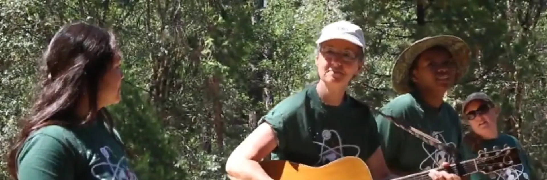 Marianne strums guitar. Three women wearing matching green shirts stand next to her