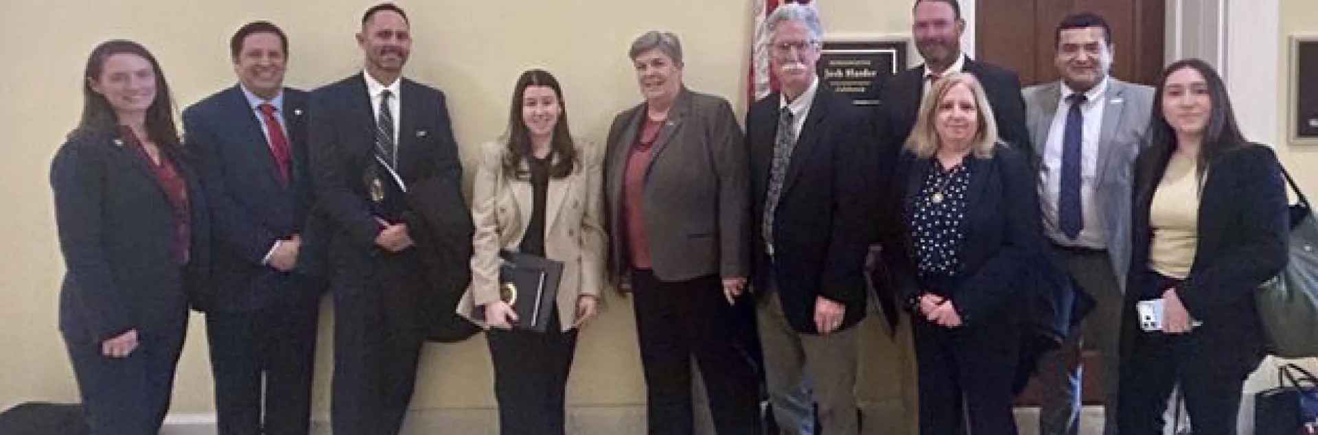 A woman and six men wearing suits stand in front of U.S. flag and Rep. Adam Gray's office plaque.