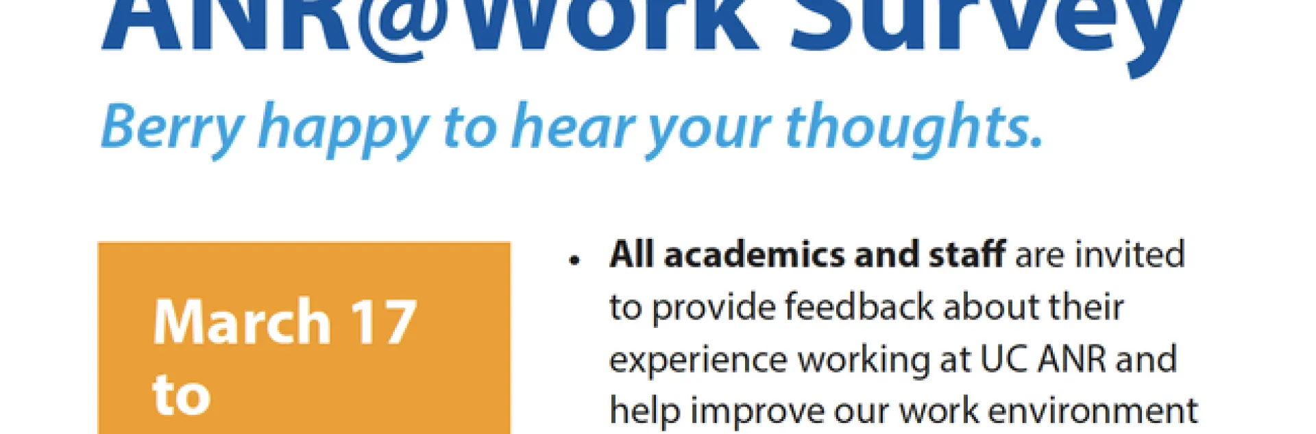 The UC ANR community is founded on principles strengthened by common goals, shared interests, camaraderie and a passion for improving the quality of life in all communities. We all have the right to work in an environment that promotes fairness, trust, respect, and physical and emotional safety and security. Your anonymous survey responses will contribute to our efforts to create the best possible work environment for all of us.