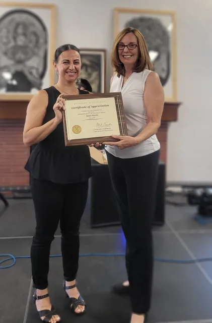 Hartin receives a certificate of appreciation from Rita Clemons, UCCE county director for Riverside, San Bernardino and Orange counties.