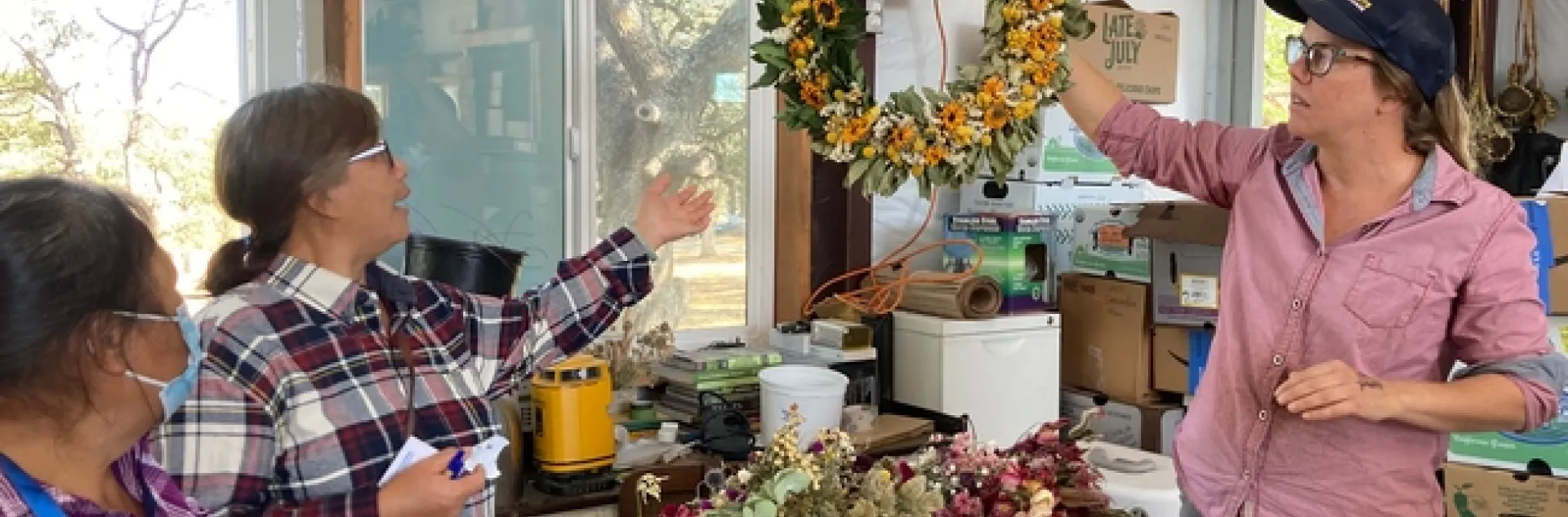The farmers met at the UCCE Sacramento County office, then traveled by bus to Winters to meet walnut grower Craig McNamara at Sierra Orchards, who talked about the benefits of hedgerows. Their second stop was Rainwater Farm, a flower farm owned by Lauren McNees, former UC ANR program and event specialist, and her husband Lee.