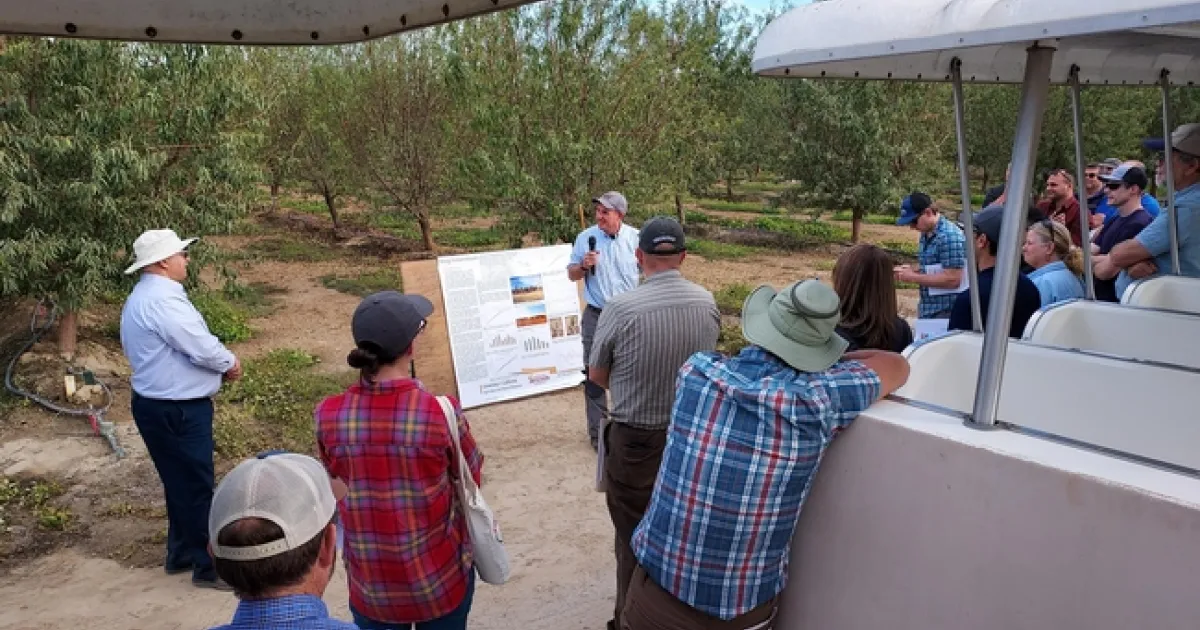 Other topics covered on the tour by Kearney research staff included groundwater recharge in alfalfa by Bali and project scientist Moneim Mohammed, Solbrio grapes and Sunpreme raisins by UCCE specialist Matthew Fidelibus, cover crops in pistachio orchards as a means to reduce navel orangeworm emergence from mummies on the orchard floor by UCCE specialist Houston Wilson, solar powered treatment of brackish water by UCCE specialist Daniele Zaccaria and staff research associate Luke Paloutzian, and the effects of soil bio-stimulants to reduce water stress in almonds was discussed by UCCE specialist Giulia Marino.