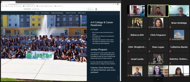 The tour opened with the We are UC ANR video and a map of UC ANR locations for background. Using short videos and photos, statewide program directors and UC ANR stakeholders showed the policymakers many of the ways UC ANR serves Californians. Other “tour stops” included highlights of UC ANR's impact on urban greenspaces, nutrition and youth development, California agriculture and wildfire resiliency.