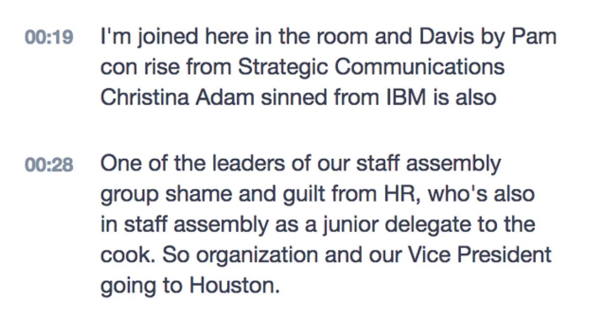 Both links display an autogenerated transcript of the audio, but the transcript is not a reliable representation of the discussion. For example, John Fox's introductory statement was transcribed as “I'm joined here in the room and Davis by Pam con rise from Strategic Communications Christina Adam sinned from IBM is also One of the leaders of our staff assembly group shame and guilt from HR, who's also in staff assembly as a junior delegate to the cook. So organization and our Vice President going to Houston.”