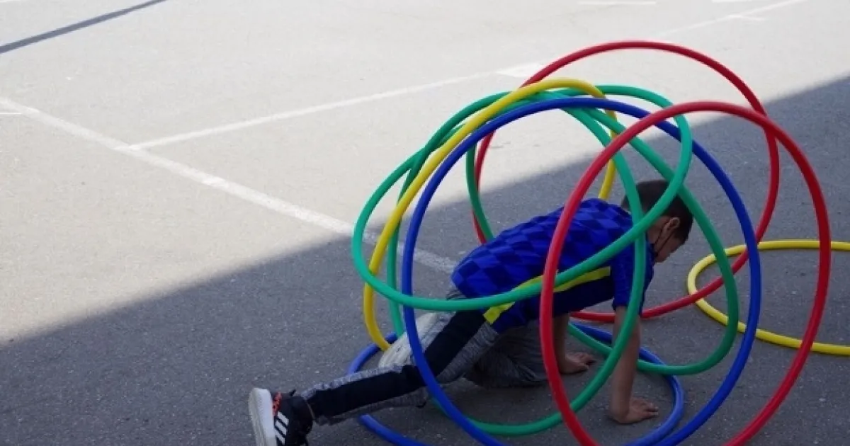 A child surrounded by red, green, blue and yellow hoops on a playground stretches his leg.