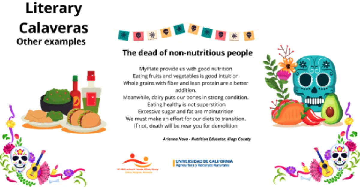 Calaveras Literarias, or Literary Skulls, are compositions of verse and rhymes, originally from Mexico. These are typically circulated in the days leading up to the Day of the Dead. They are fun, irreverent expressions that usually satirize a well-known person or event by playfully parodying the inevitable death of those involved.