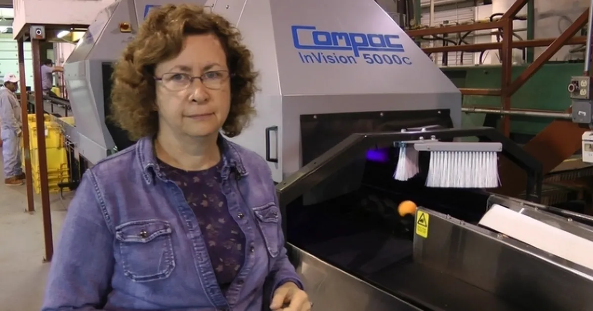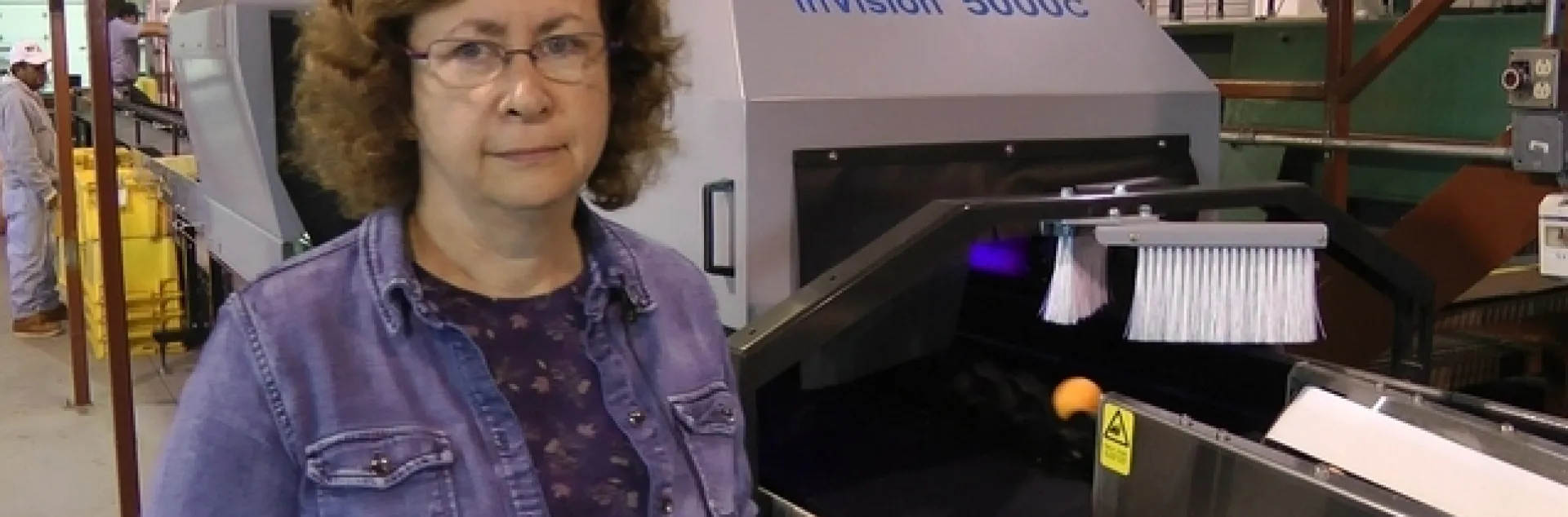 Dr. Beth Grafton-Cardwell in front of the state-of-the-art fruit grader. The equipment purchase was funded by the Citrus Research Board.