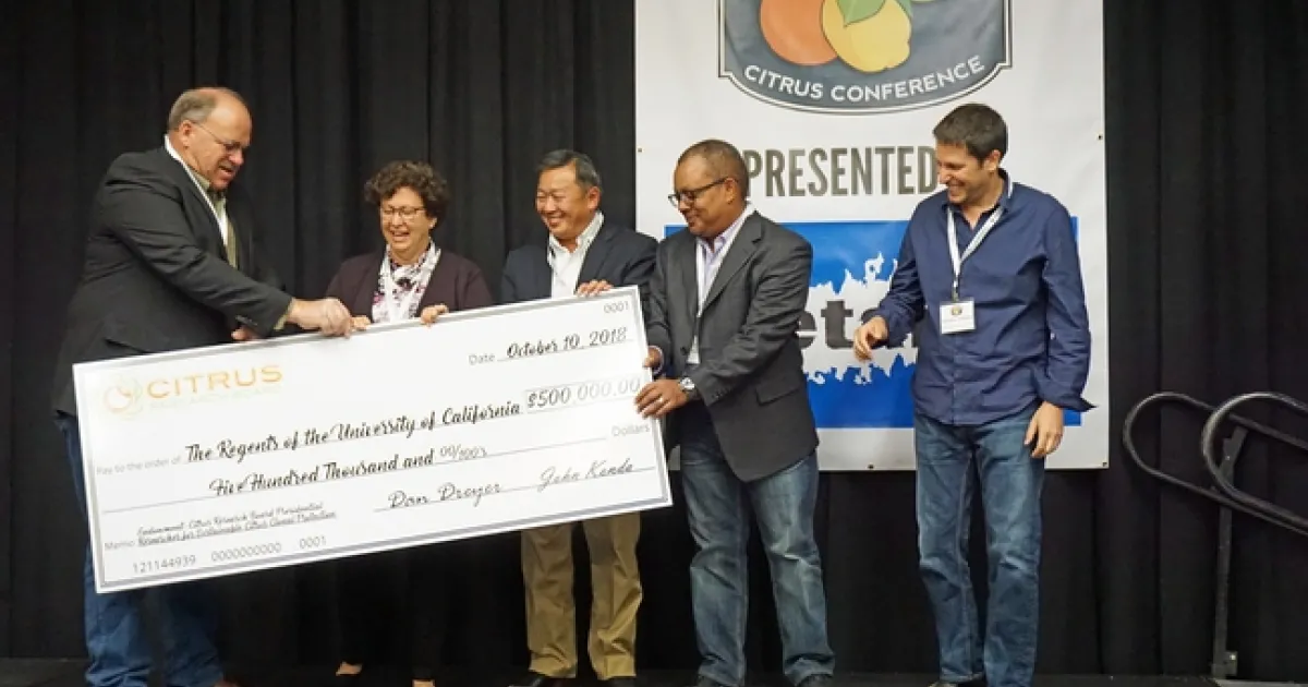 The Citrus Research Board and UC Agriculture and Natural Resources have established a $1 million endowment to fund the Presidential Researcher for Sustainable Citrus Clonal Protection at the UC Lindcove Research and Extension Center. The endowed researcher will provide a UC Cooperative Extension scientist a dedicated source of funds to support scholarly activities focused on the long-term sustainability of the citrus industry.