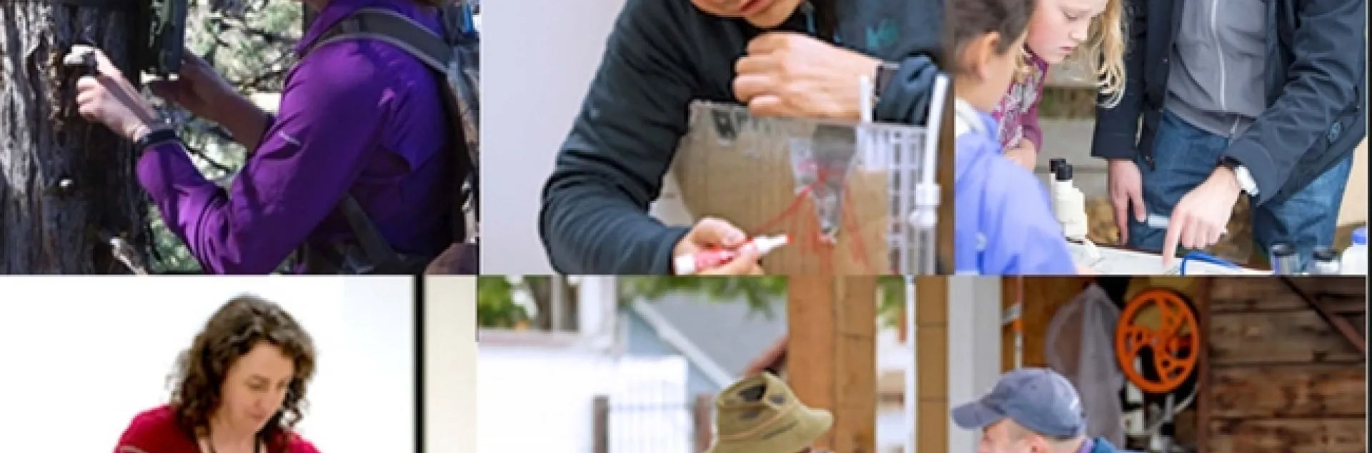 Collage of 5 UC Cooperative Extension scientists working. Woman in purple shirt examines tree bark. Latino man draws to show groundwater movement in soil. Man in sunglasses points to insects as blonde and brunette girls look on. Woman with dark brown hair demonstrates soil movement in 2 large jars of water. Man in baseball hat slaps the back of a man in urban garden.