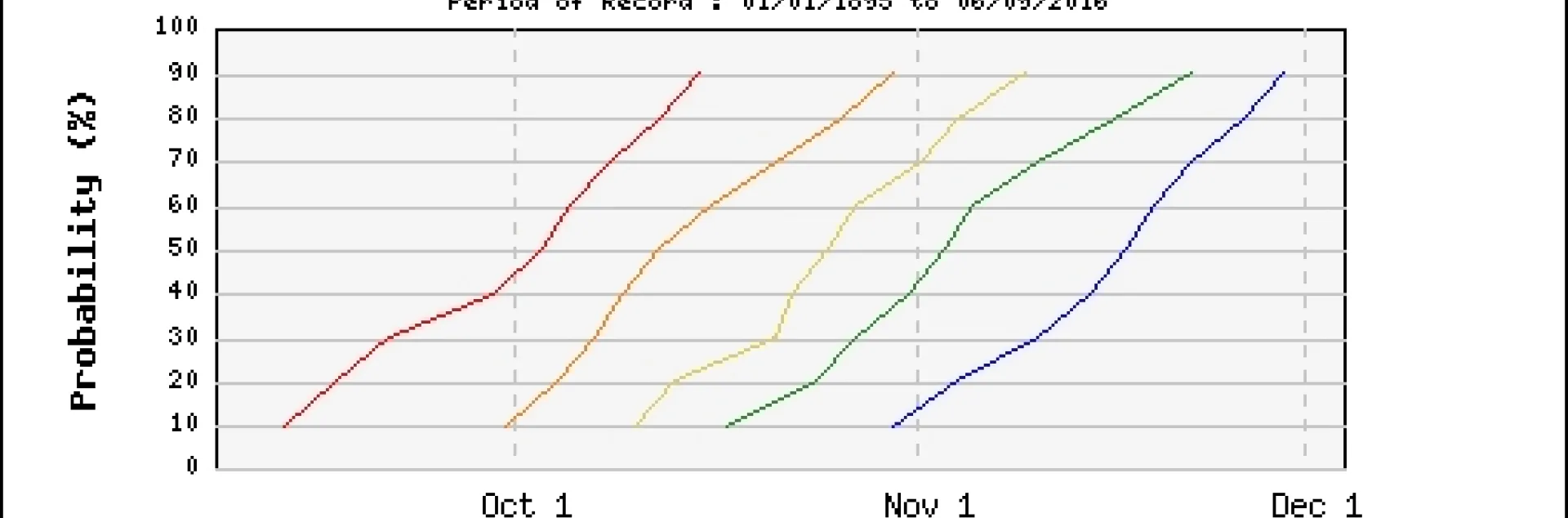 There are two ways to think about frost dates. Here is the first and conceptually easiest to understand: Average first frost date along with an estimate of the spread of when that might happen. The table below shows the average first frost of fall and a range of dates that shows where there is about a 70% chance the the real frost date will fall.