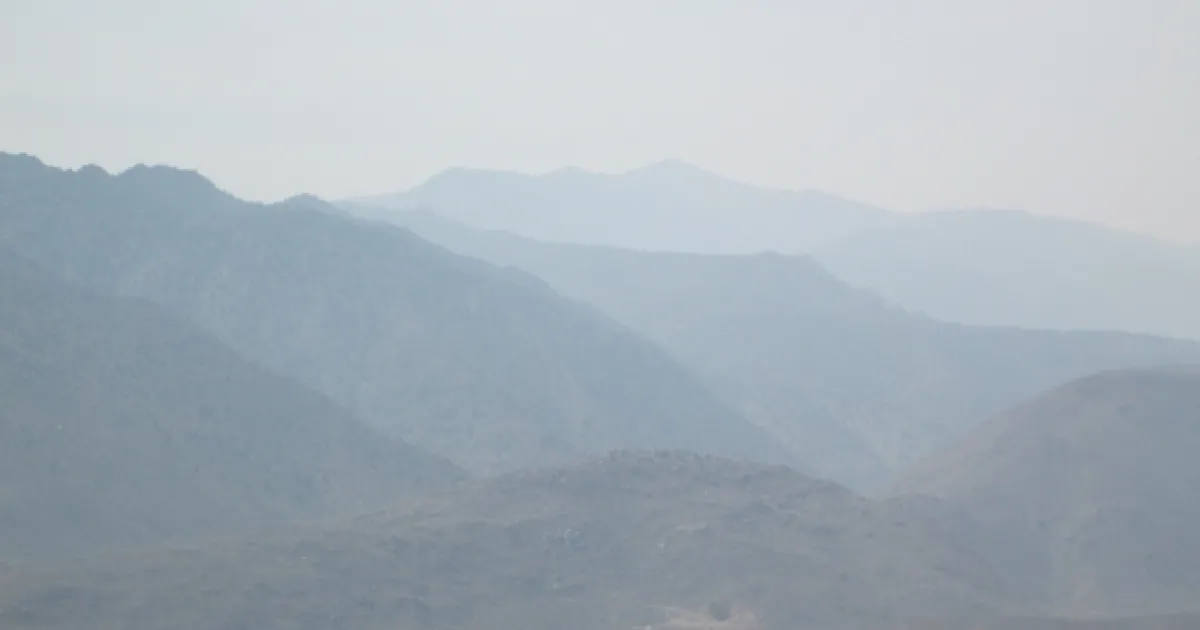 Rugged, mountainous terrain blanketed in a smoky haze.