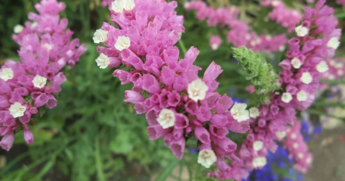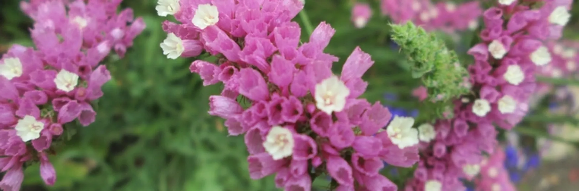 There were just five statice seeds in the packet which I planted in a cell pack in spring. Once again they all germinated. I potted them on, and luckily I kept them inside until after our last frost. Once planted out they sat rather forlorn-looking for several weeks but then the rosettes of basal leaves suddenly grew rapidly and the next thing was that flower spikes shot up giving a lovely display of pink and blue. It is the calyx of the flowers that give the pink, blue or violet color while the corolla is white, or sometimes yellow. Apparently these flowers keep their color very well if dried although I shall have a hard time cutting them to see if this is true!