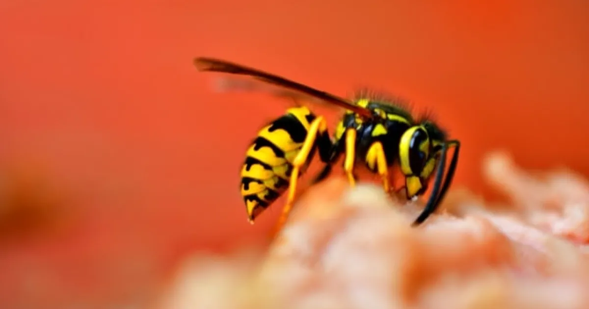 Yellowjackets are 1⁄2 to 1 inch long with jagged bright yellow and black stripes. Their “waists” are barely visible. Unlike other common wasps, yellowjackets scavenge on human food. They nest in holes in the ground, inside wall cavities, or in hanging nests totally enclosed in gray paper with a single entrance. The western yellowjacket usually nests in the ground using an abandoned burrow, but occasionally nests in crawlspaces. Underground, the nest is a papery structure that provides a home and breeding area for the queen and contains cells where young are raised. Yellowjackets forage for a broad range of foods, but they often come into conflict with humans when they are attracted to meat, carbonated beverages, juices, desserts, deceased animals, and other food items.