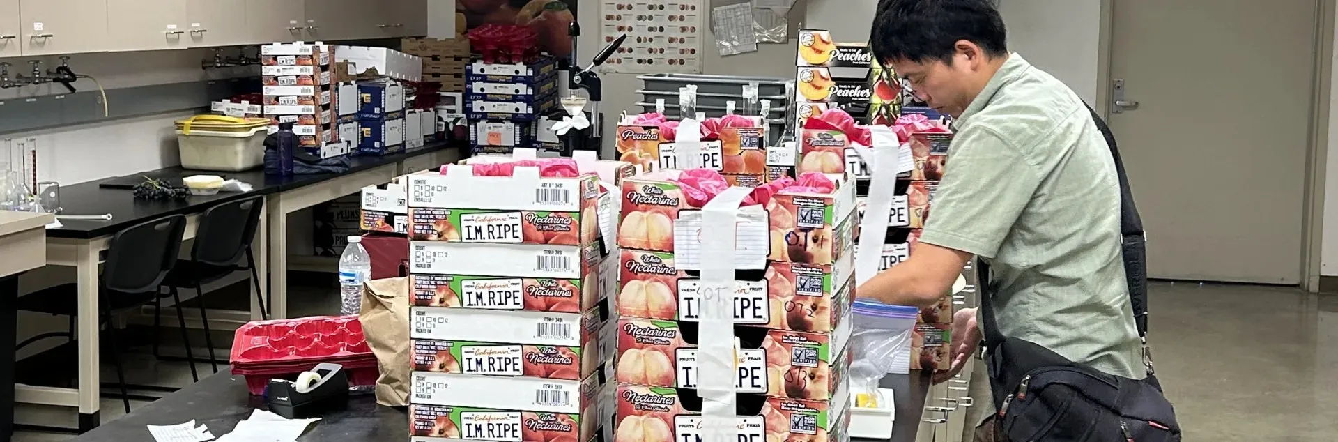 Po-Kai Huang, investigador de postdoctorado junta a cajas de ciruelas..