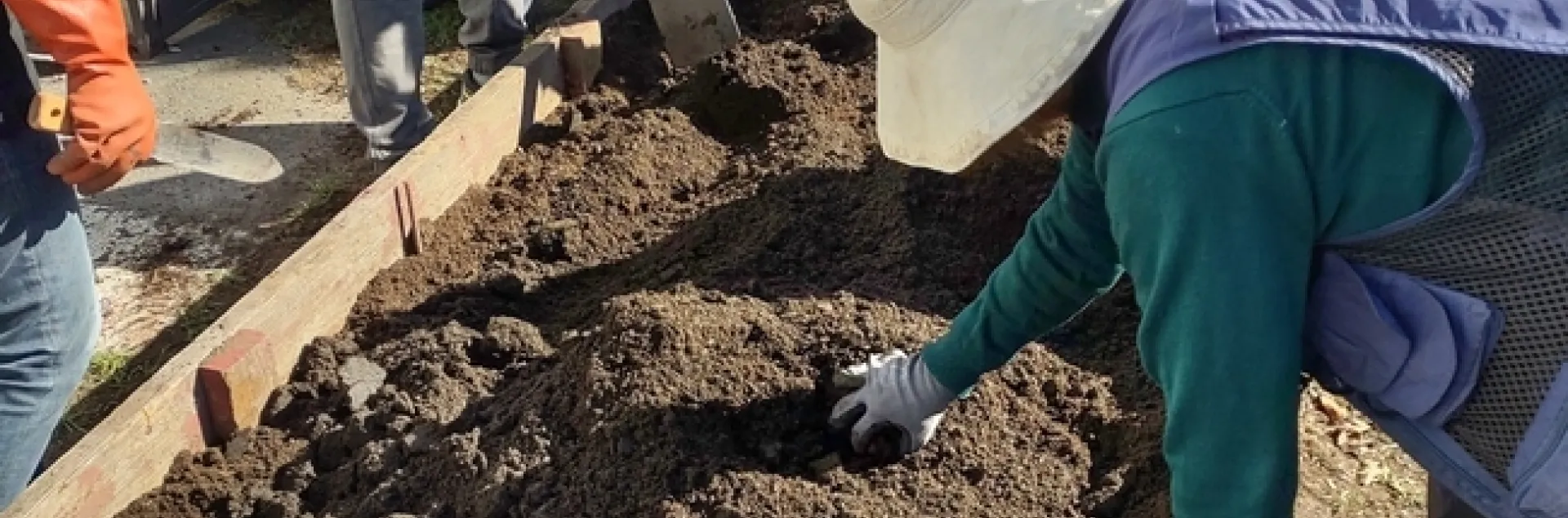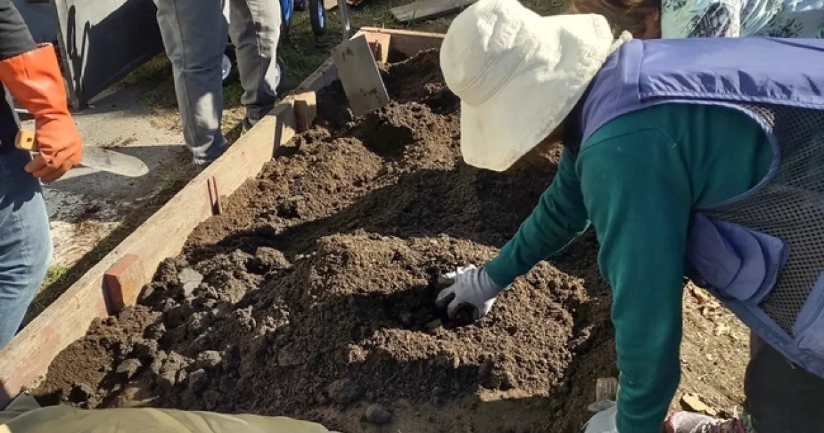 Voluntarios y residentes preparan la tierra para empezar a plantar.