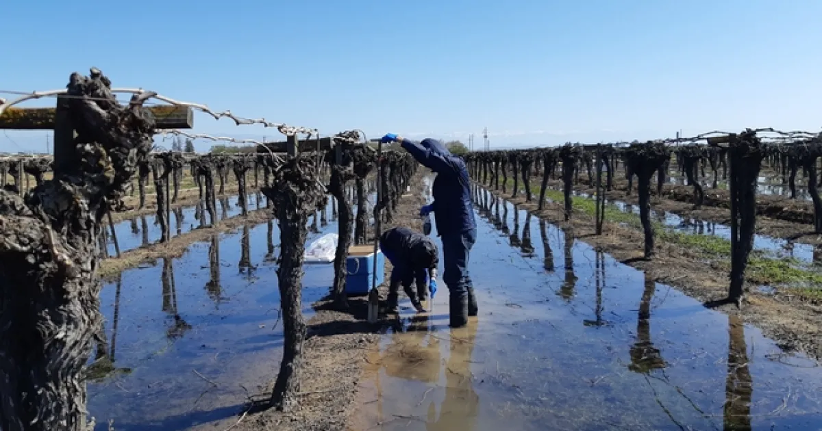 Un estudio recientemente publicado por científicos de UC proporciona nuevos datos sobre la forma en que se desplaza el nitrato hacia un sitio de recarga agrícola y qué pueden hacer los agricultores para reducir una posible lixiviación (filtración). Los investigadores analizaron información de dos viñedos en el centro de investigación, Kearney Agricultural Research and Extension Center en el condado de Fresno, uno de ellos estuvo inundado durante dos semanas y el otro durante cuatro.