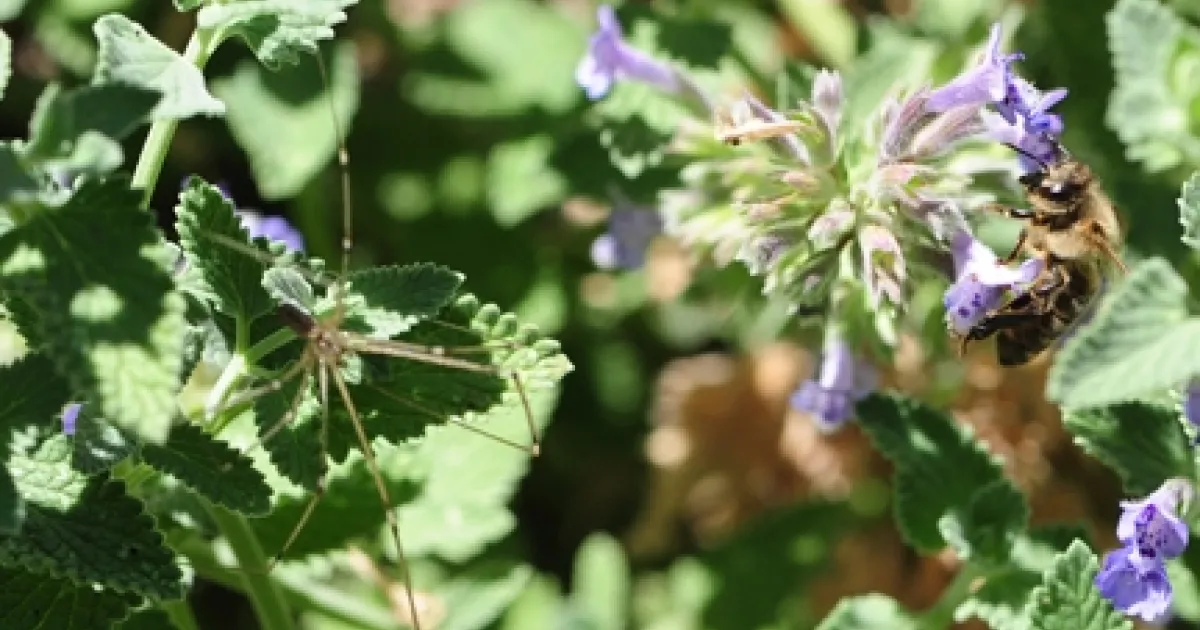 This cellar spider, however, crawled along a catmint stem to wait for prey. A honey bee buzzed down and began nectaring one of the lavender blossoms.