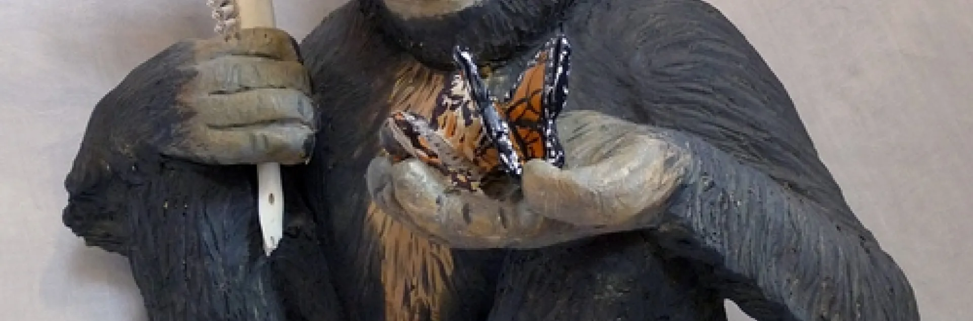 A chimpanzee holds a monarch butterfly in a ceramic art work titled “Darwin.”