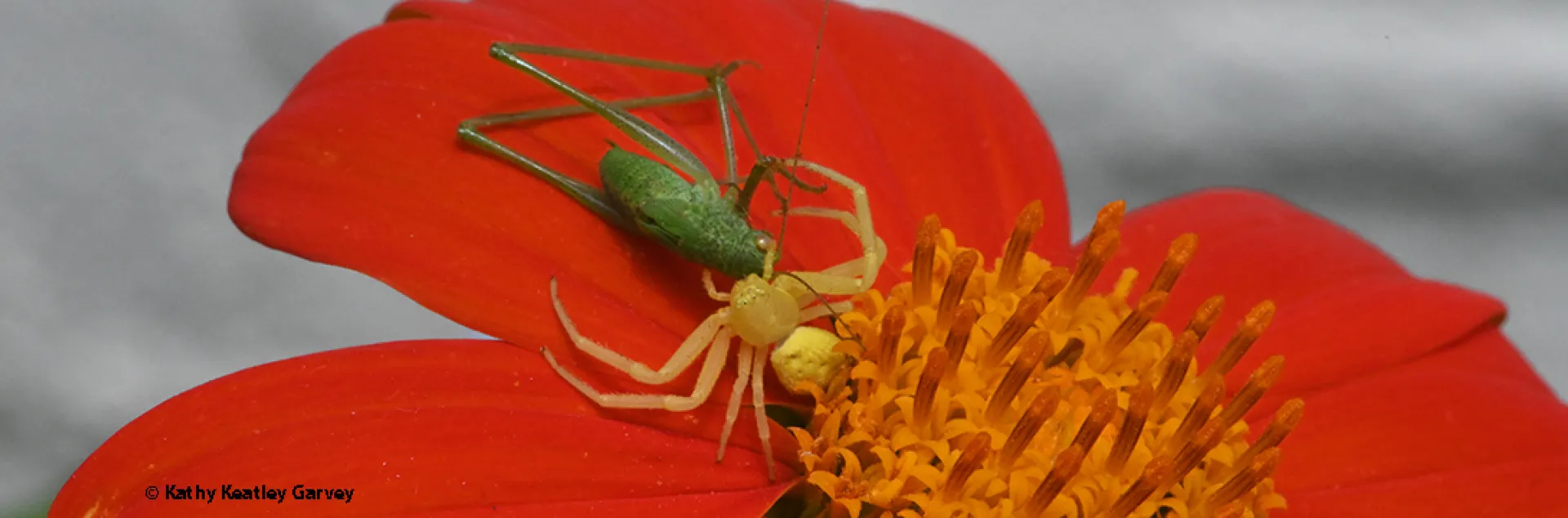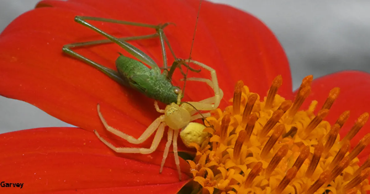Cover Image: Crab spider nailing a grasshopper on a Mexican sunflower, Tithonia rotundifola. (Photo by Kathy Keatley Garvey)