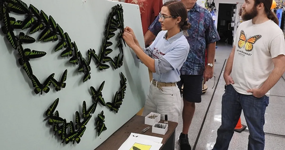 The most current art/science work that graces the Bohart Museum hallway of the Academic Surge Building on Crocker Lane: "Birdwing Butterfly" and "Spiral Galaxy of Butterflies."
