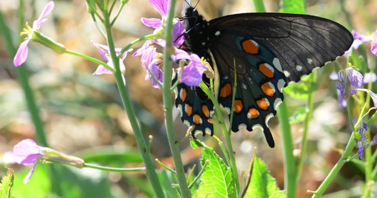 Butterfly expert Art Shapiro, distinguished professor of evolution and ecology, excitedly points to a Pipevine Swallowtail nectaring on roadside radish.