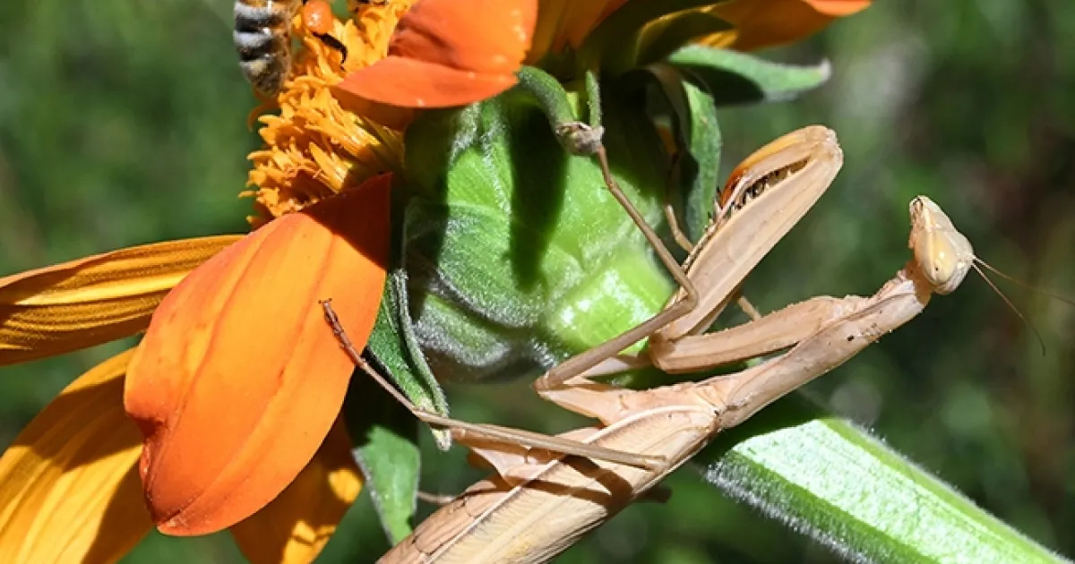 So here's this praying mantis, a female Mantis religiosa, tucked beneath a Mexican sunflower, Tithonia rotundifola, in a Vacaville garden.