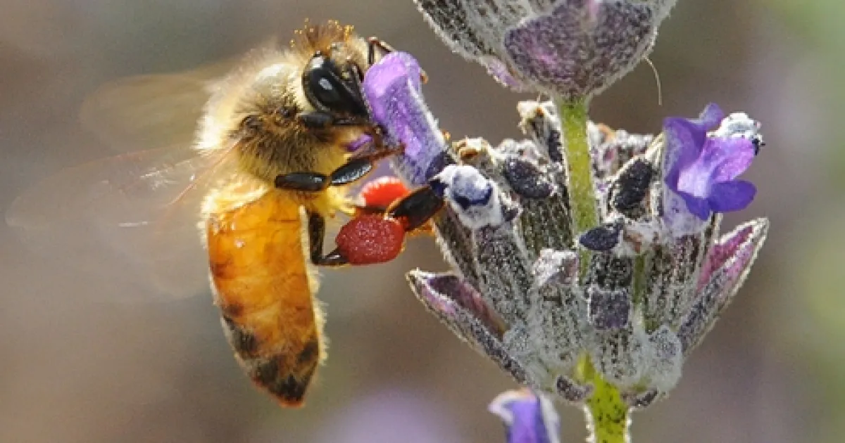 HONEY BEE, packing red pollen from nearby rock purslane blossoms, nectars lavender. (Photo by Kathy Keatley Garvey)