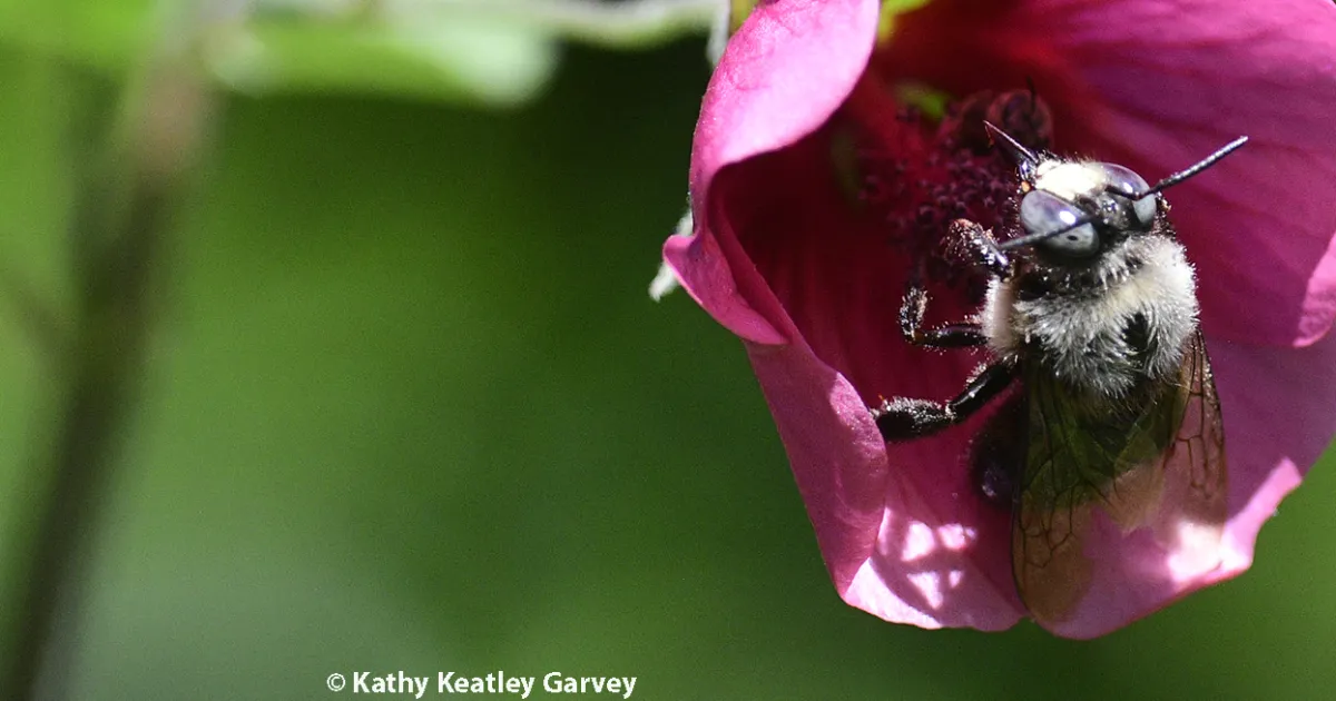 - The Valley carpenter bee, Xylocopa sonorina, formerly X. varipuncta, the largest of the state's carpenter bees. It's about an inch long. The female is solid black, while the male, commonly known as "the teddy bear bee," is a green-eyed blond. Why teddy bear? It's fuzzy and does not sting--or as the late Robbin Thorp (1933-2019) distinguished emeritus professor of entomology at UC Davis, was fond of saying: "Boy bees don't sting."