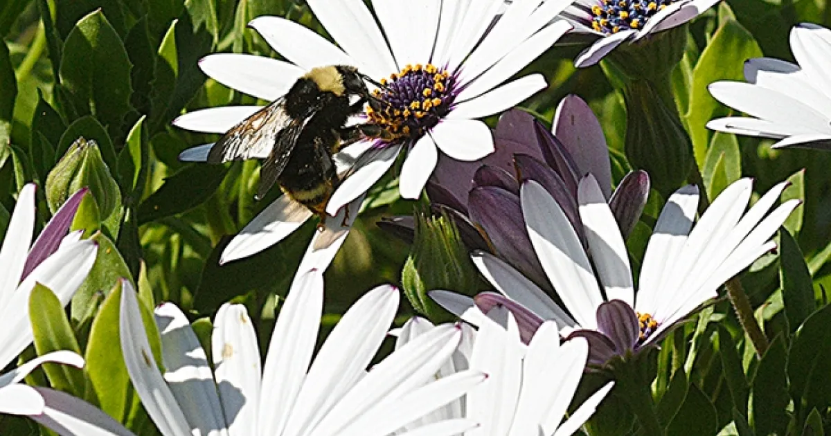 The bee buzzed cautiously amid the pink and white flowers, near anglers, kayakers, picnickers, bench occupiers, and walkers.