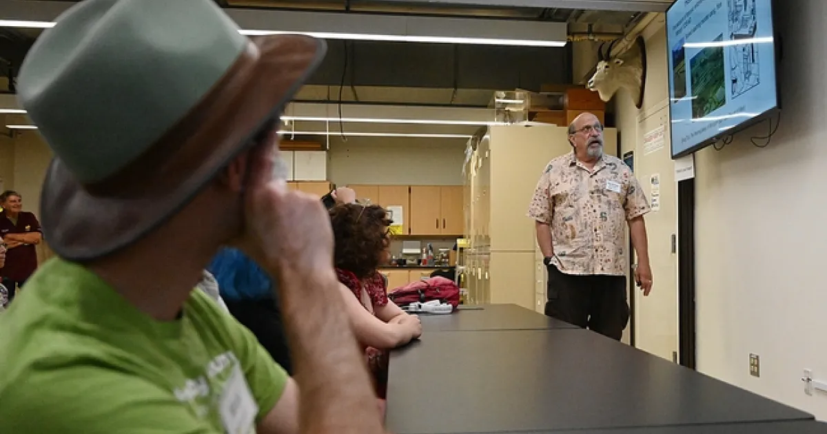 Forensic entomologist Bob Kimsey discusses the life cycle of a blow fly. (Photo by Kathy Keatley Garvey)