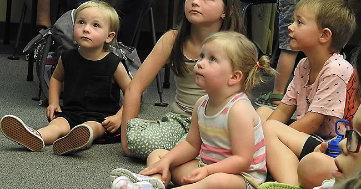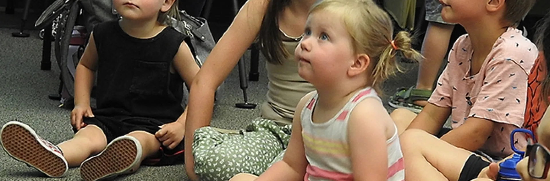 The audience, ranging from toddlers to teens to senior citizens, are inside the the Vacaville Public Library. Some sit on the carpet and others occupy the chairs circling the room.