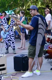 - Ant specialist and bass guitarist Brendon “Hype Man-tis” Boudinot of the Phil Ward lab dressed in a green helmet, a blue and gold EGSA bee shirt, and a UC Davis cow costume to showcase his department and campus-wide love of bovines.
