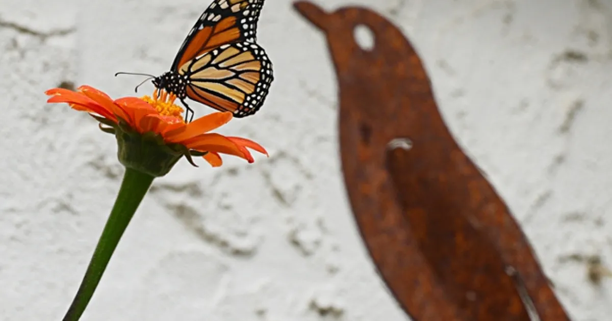 A monarch butterfly fluttered into our pollinator garden in Vacaville yesterday and sipped nectar from a Mexican sunflower (Tithonia) as a bird looked on.