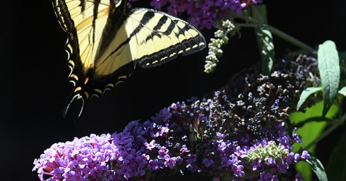 A Western tiger swallowtail, Papilio rutulus, nectaring on a butterfly bush, Buddleja davidii. (Photo by Kathy Keatley Garvey)