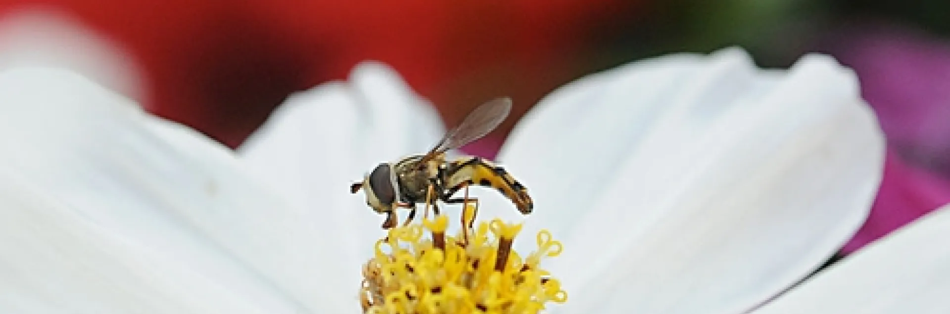 Plant cosmos. Attract syrphids. Capture an image of a syrphid on a cosmos.
