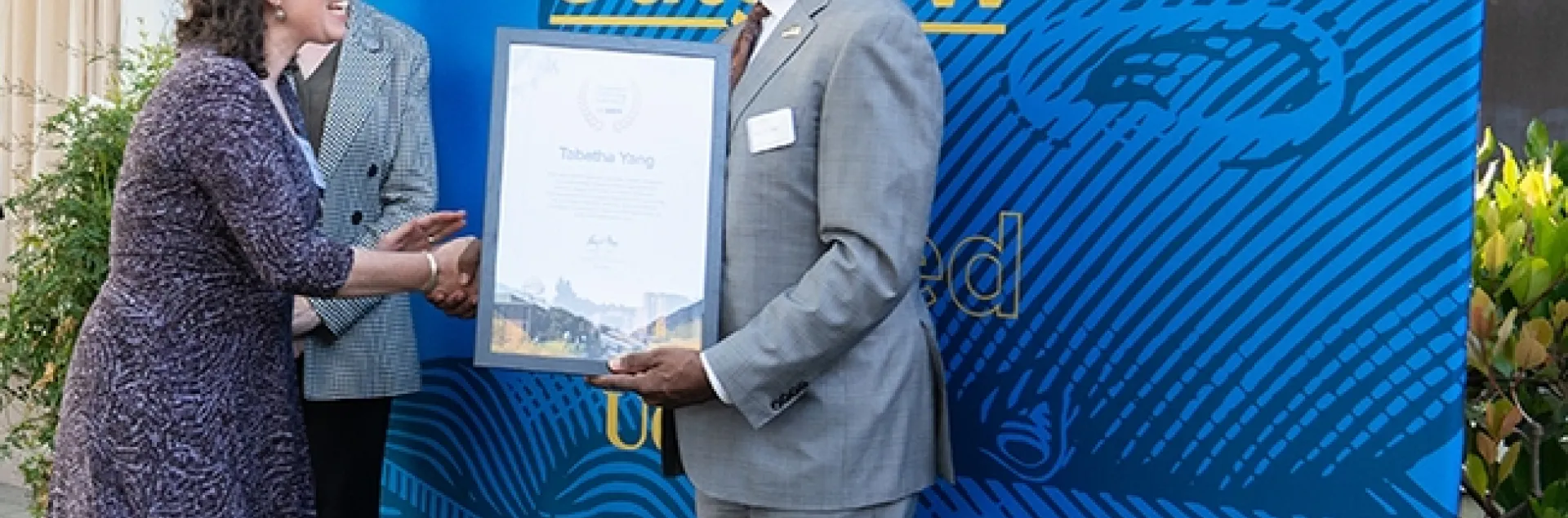 On April 29, Tabatha Yang was at UC Davis Chancellor Gary May's residence to accept the Chancellor's Outstanding Staff Award for Exceptional University Management and Exceptional University Impact with 11 other outstanding staff.