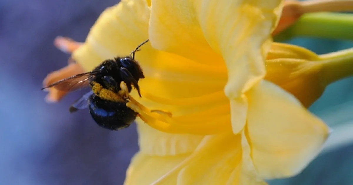 In the early morning, they buzz into the patch of day lilies to forage for nectar and pollen. When they're finished, it's easy to tell where they've been: they're covered with telltale yellow pollen.