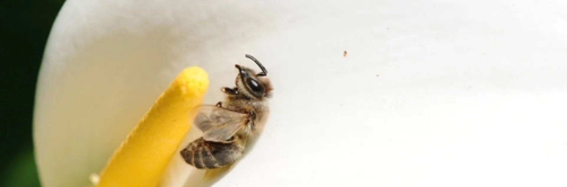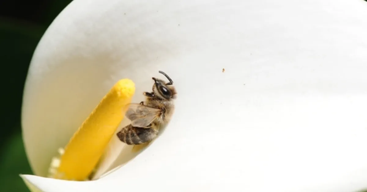 When we were walking through the Carolee Shields White Flower Garden at the UC Davis Arboretum last weekend, we spotted the still body of a honey bee on a white calla lily (Zantedeschia aethipica), a native of South Africa.