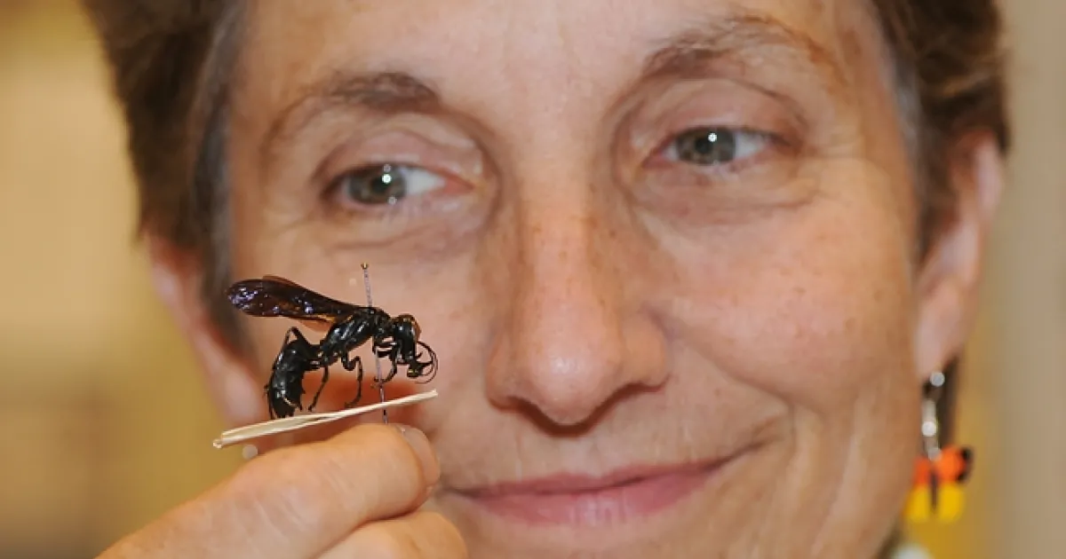 Lynn Kimsey with a gigantic "warrior wasp" she discovered on the island of Sulawesi, Indonesia. (Photo by Kathy Keatley Garvey)