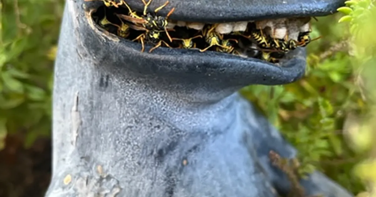 Check this out! On Aug. 8, sharp-eyed Adrienne R. Shapiro of Davis spotted a colony of European paper wasps, Polistes dominula, nesting in the mouth of a garden frog statue in The Cannery neighborhood, Davis.