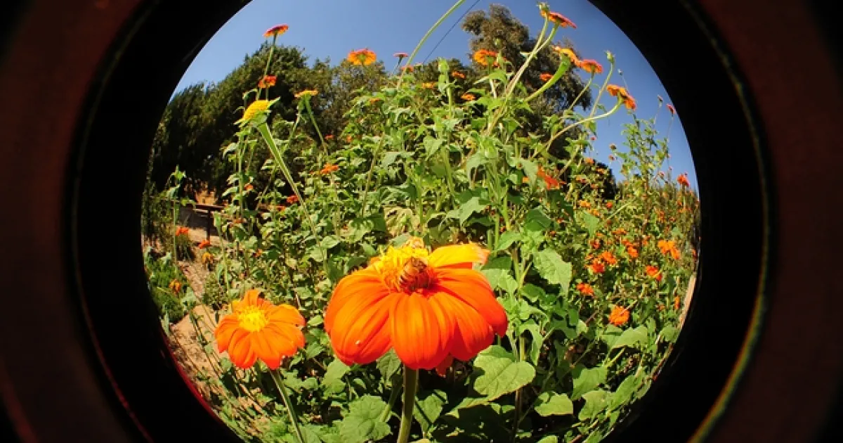 What does the raised bed of Mexican sunflowers (Tithonia) in the Häagen-Honey Bee Haven at the University of California, Davis, look like with a fisheye lens?
