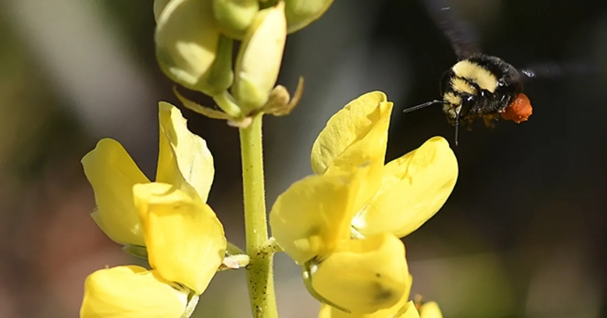 Packing red pollen from lupine, Lupinus arboreus, a yellow-faced bumble bee, Bombus vosnesenskii, heads toward more blossoms at Doran Regional Park, Bodega Bay. (Photo by Kathy Keatley Garvey)